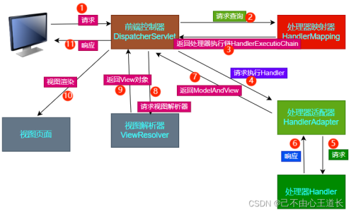 SpringMVC核心架构具体流程分析 ①前端浏览器发送请求首先到达DispatcherServlet,Dispatc...